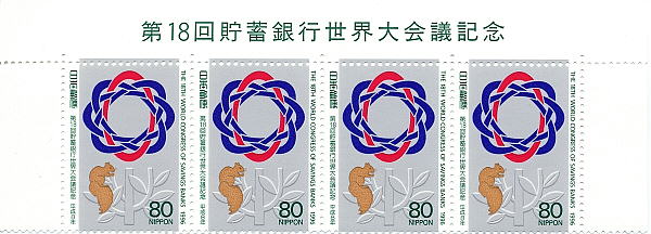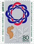 第18回貯蓄銀行世界大会議記念。 くどいようですが、やっぱり貯蓄=リスです。世界大会議でもリス。 ちなみに、リスが登ってる木は、1円玉のデザインと同じように見えますけど、どうでしょ? シンプルで結構好きなデザイン。でも切手はアカリスとかエゾリスっぽいのに、初日カバーの絵はなぜかシマリス…。
