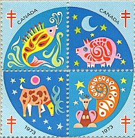 切手ではなく、複十字シールです。それにしてもすんごいキッチュとゆーかカラフルとゆーか大胆とゆーか。えらいことになっちゃってるリスですねぇ。シッポとか、アンモナイトか?…みたいな。大腿部もピンクの羽根みたいになっちゃってるし。顔や手足は肌色だし。でもって頭に毛が三本て。 カナダってこんなセンスだったのか…。(個人的には東欧っぽい感じがする。いえ、まぁ、なんとなく…)